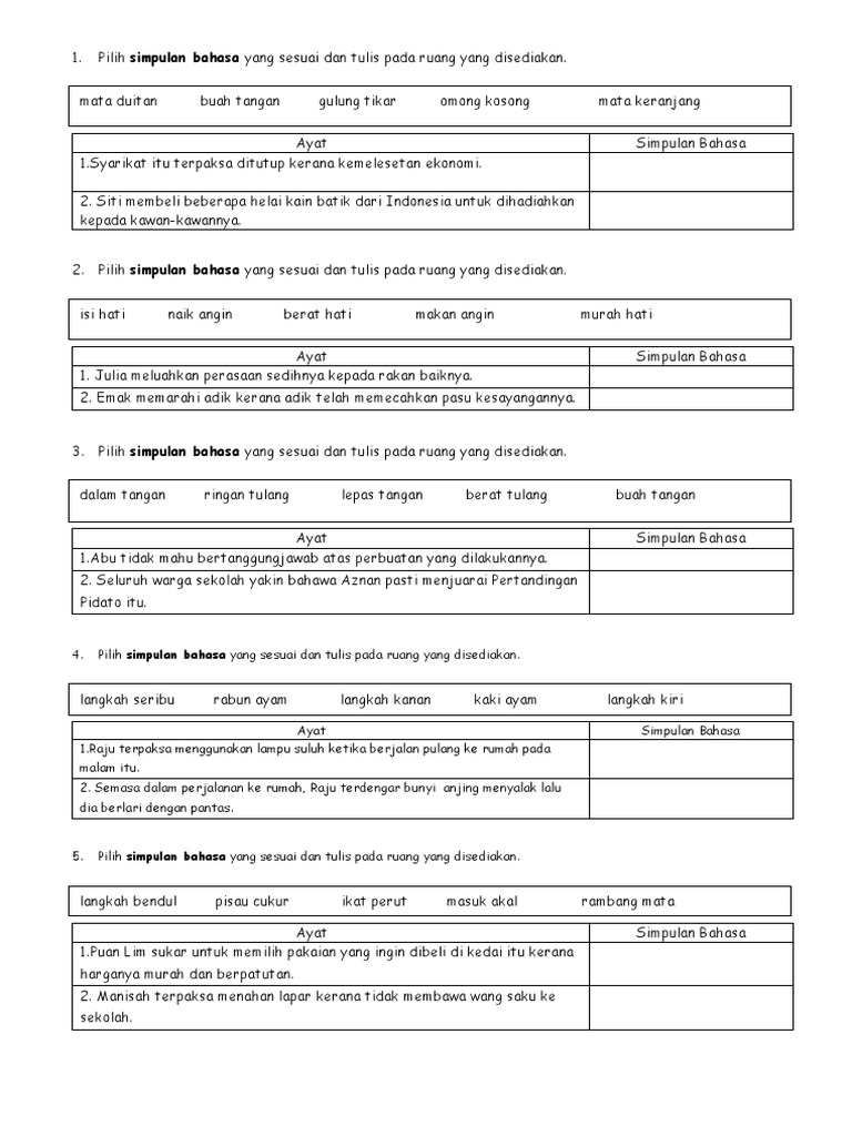 Pilih Simpulan Bahasa Yang Sesuai Dan Tulis Pada Ruang Yang Disediakan